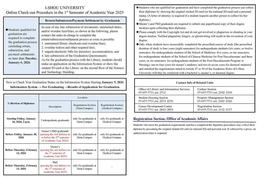 I. Students who are qualified for graduation are required to complete the check-out procedure (Return/Submission/Payment Settlement) no later than January 6, 2026 (Thursday). As for the check-out procedure with the Library, students should make an application on the Information System or show the student ID card at the Library on the second floor of the Science and Technology Building.