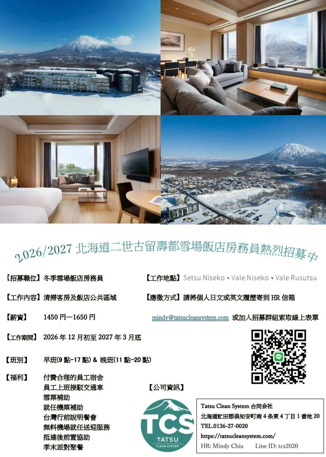 2026/2027北海道二世古留壽都雪場飯店房務員熱烈招募中